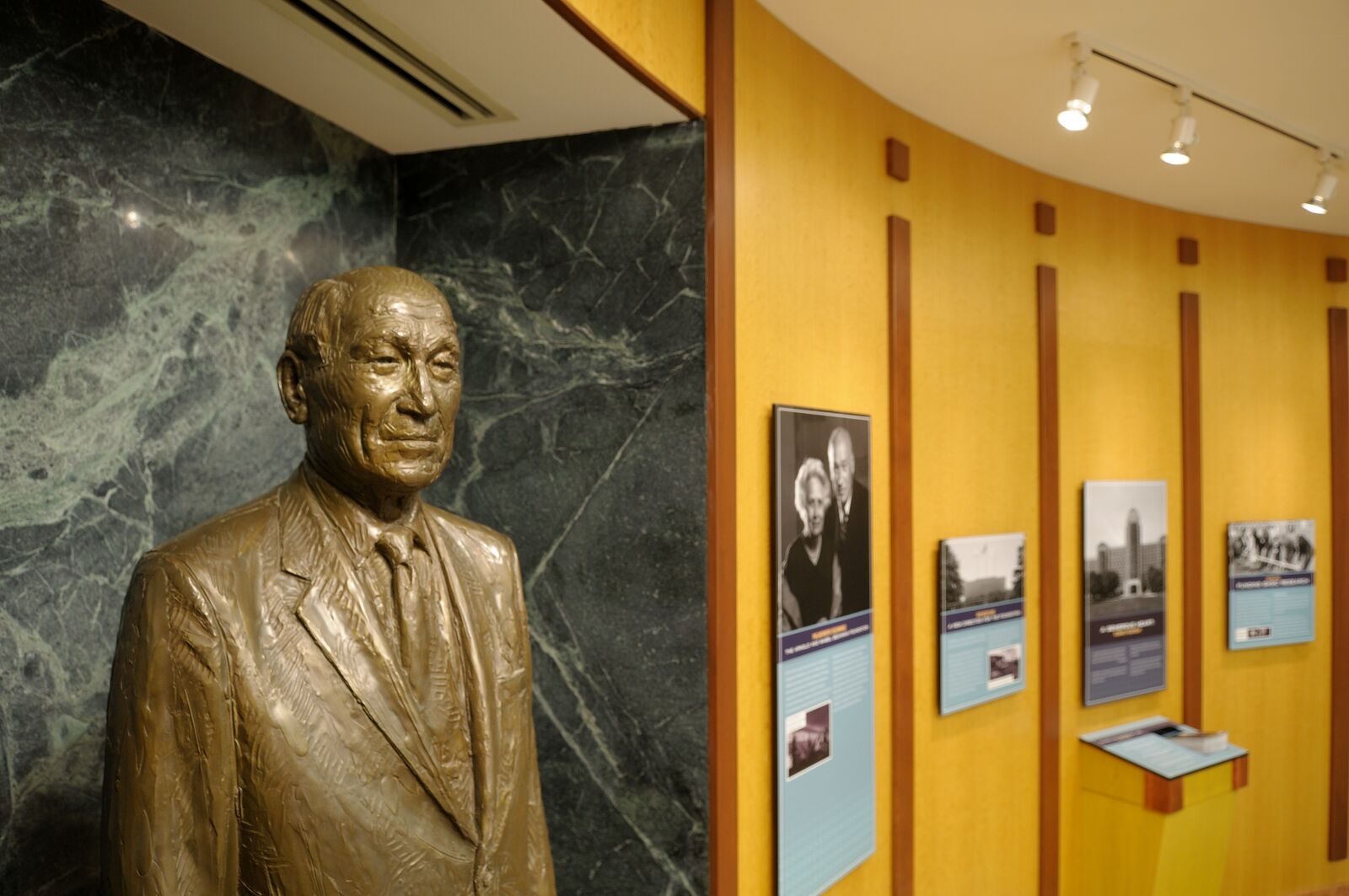 - On the east side of the exhibit, see a copy of Arnold’s 90th birthday card, signed by five consecutive former U.S. presidents.