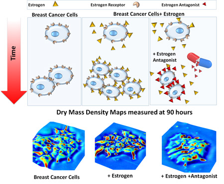 The process uses spatial light interference microscopy (SLIM) developed at the Beckman Institute by Popescu and his lab. The researchers used the SLIM instrument to precisely measure the growth of breast cancer cells and the effects of drugs that promote or inhibit the growth of these cells.