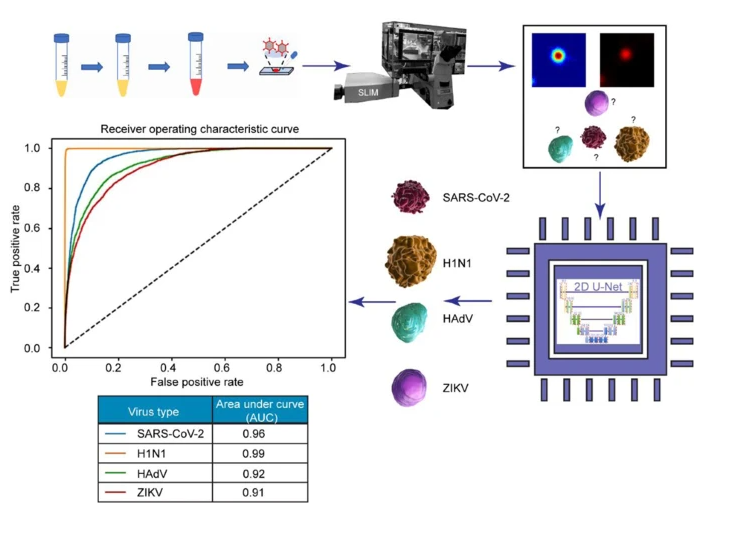 The AI discerned between four particles: SARS-CoV-2, H1N1, HAdV, and ZIKV. The preclinical trial resulted in a 96% success rate for SARS-CoV-2 detection and classification.They introduced the AI program to a pair of images: a stained SARS-CoV-2 particle producing fluorescence, and a phase image captured with a fluorescence-SLIM multimodal microscope. The AI is trained to recognize these images as one and the same. Easily recognizable, the fluorescence-stained image functions like training wheels; with enough repetition, the machine learns to detect the viruses directly from the SLIM, label-free images without the added support.